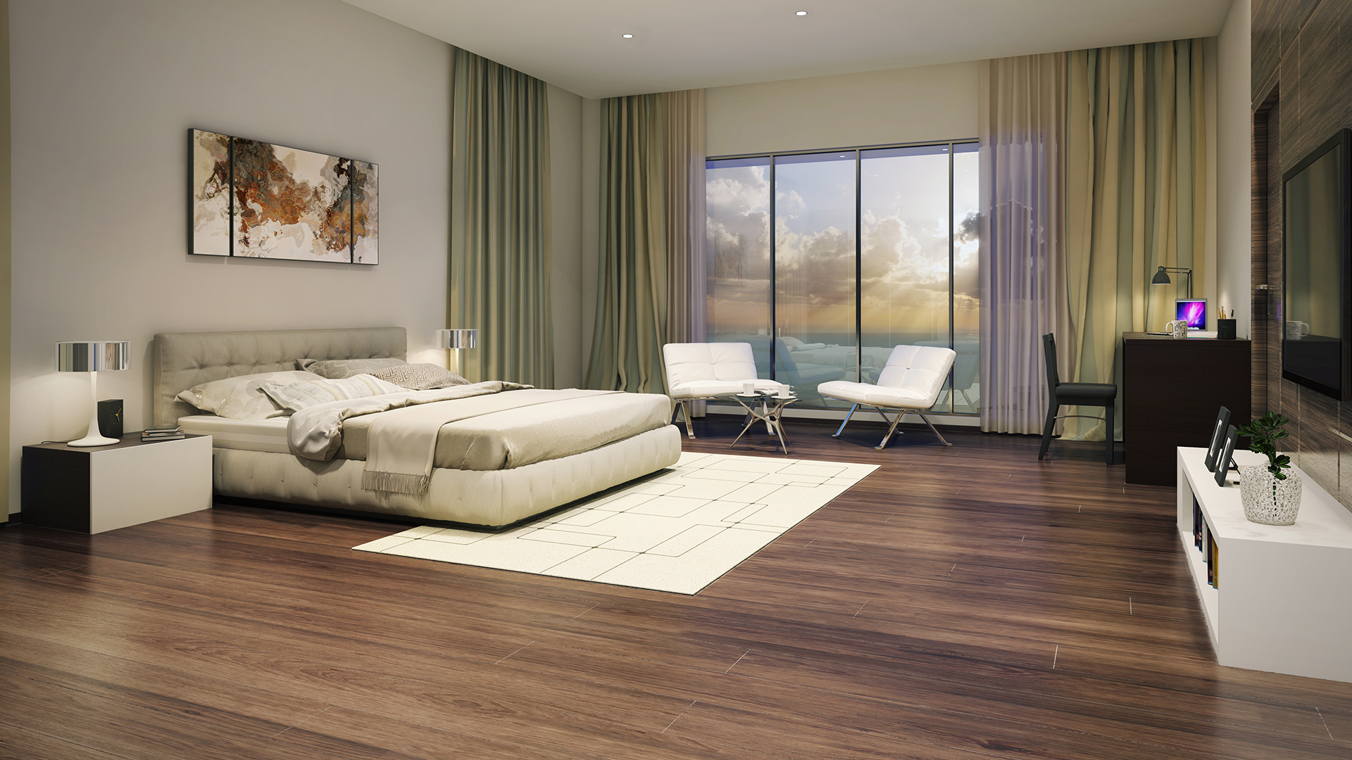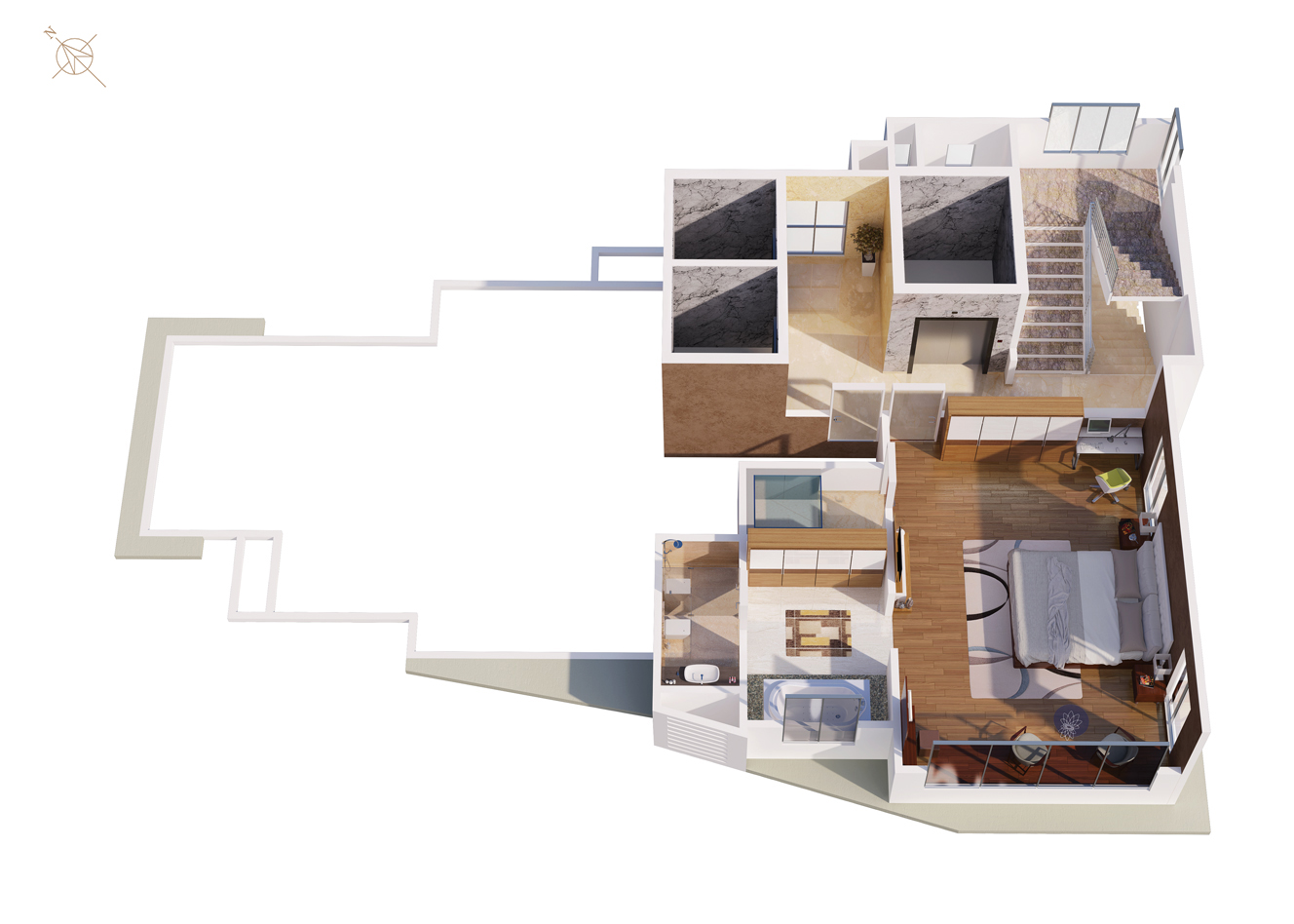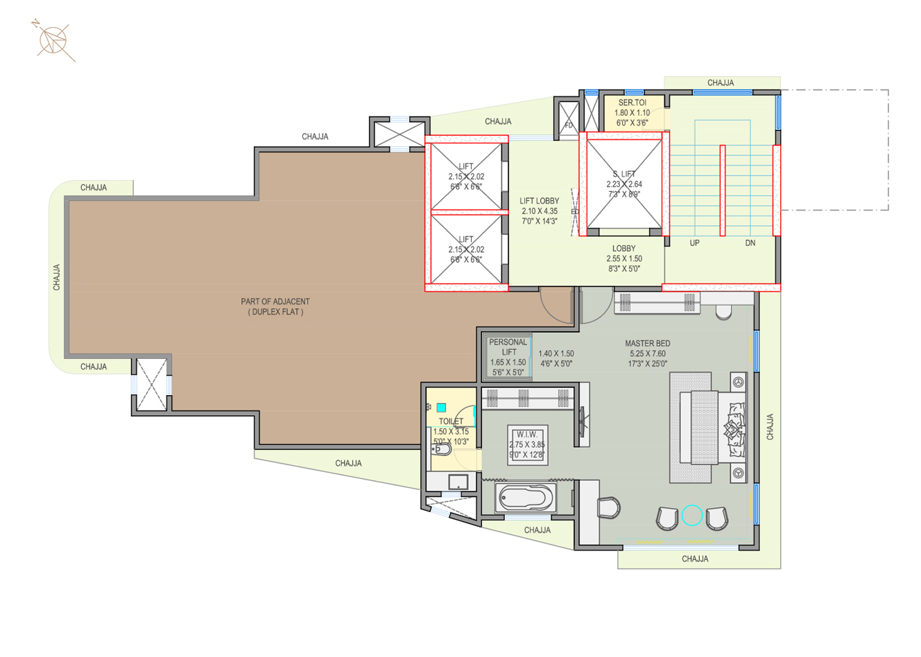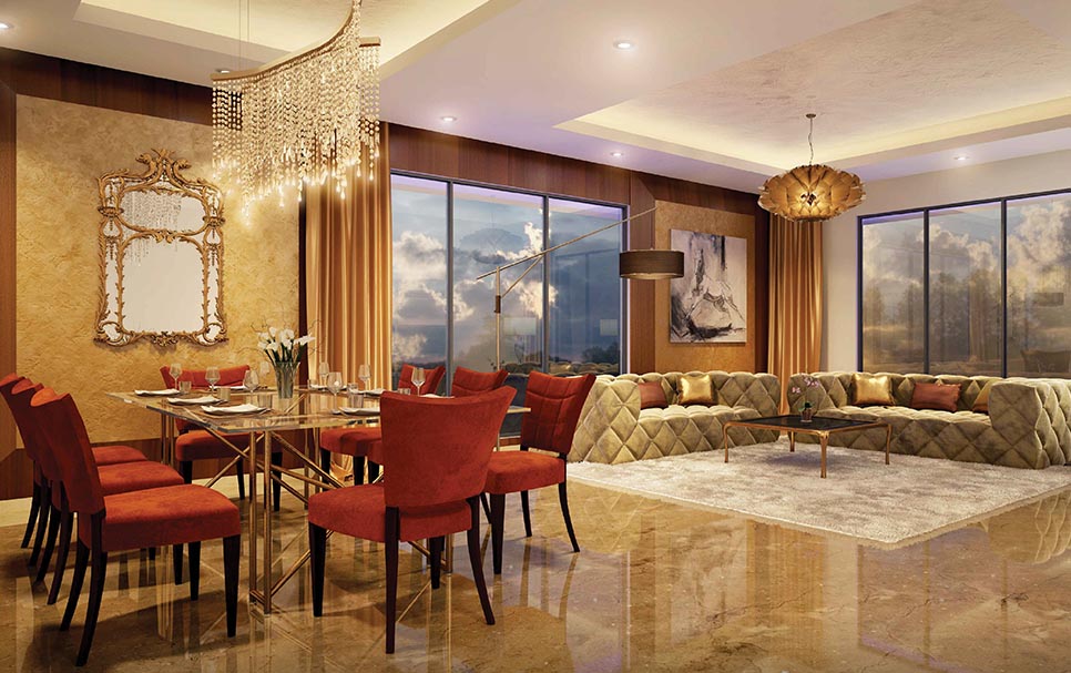 These luxurious 4 bedroom duplex apartments are spread across 2207 sq ft. carpet area. Each of them offer a beautiful view of the Queen’s Necklace, the lush green Hanging Gardens, the Babulnath Mandir and the old world Parsi colony. These suites offer a large living area coupled with a dining space besides a large kitchen, a puja room, powder bath, utility space and luxurious bedrooms at the lower level. Each of these Suites come with a personal home elevator connecting the lower level to the upper. The specially designed master bedroom at the upper level offers complete privacy and a picturesque view of the Arabian Sea. The master bedrooms are incredibly grand and cover a carpet area of approx. 645 sq ft. True to its name the expanse of the room offers space for a super king sized bed attached with a very beautiful walk in wardrobe. The jacuzzi by the window epitomizes luxury to its fullest. These duplexes are alternatively spread out over levels 9 to 20. Residents of these suites also have the entire lift lobby space available to themselves.